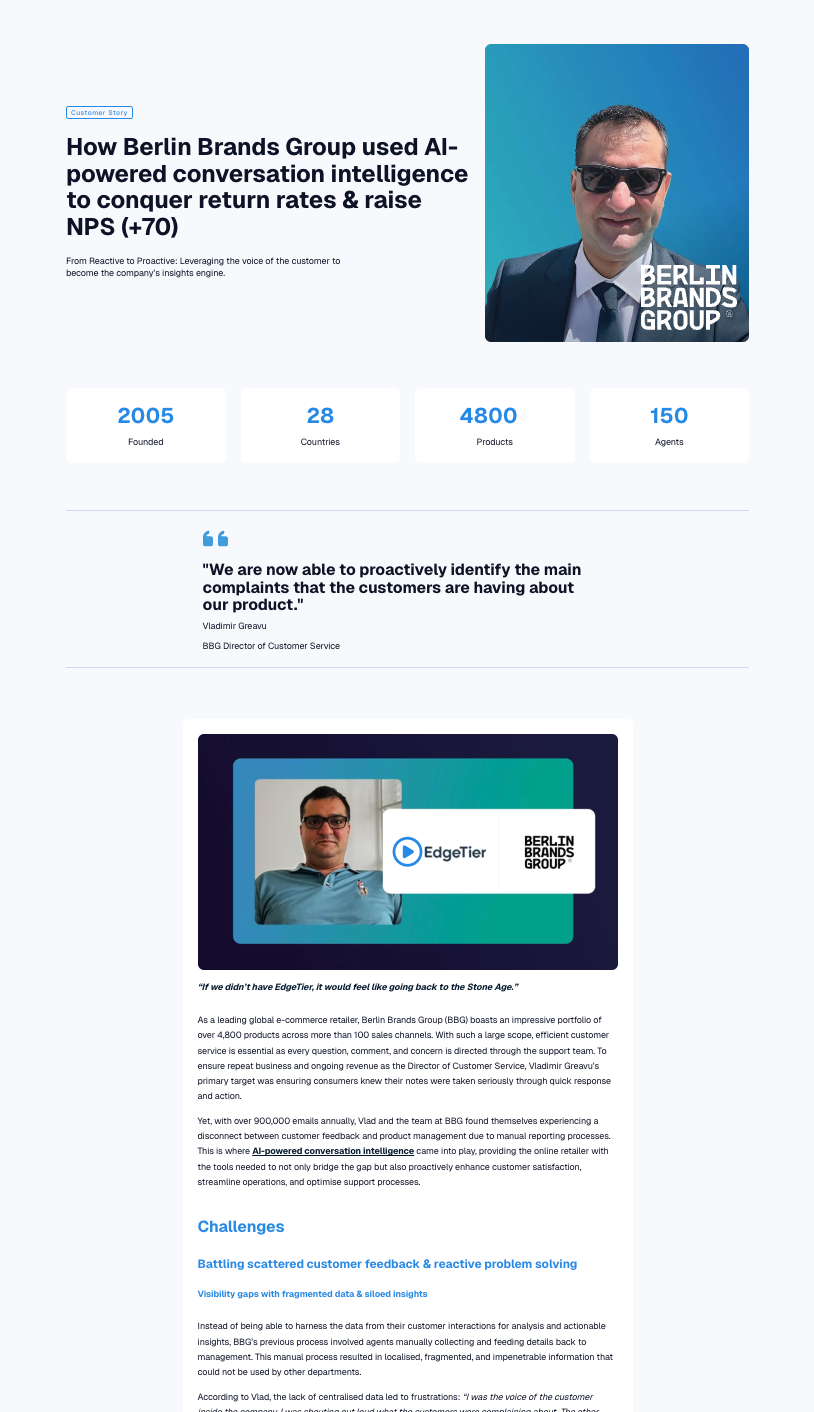 EdgeTier needed a case study that clearly demonstrated the real-world impact of its AI-powered customer service support platform. Yet, the challenge was translating highly technical specs and capabilities into a story that would resonate with both customer support teams and business decision-makers. The case study also needed to support the tech brand’s sales process at multiple points throughout the funnel.
